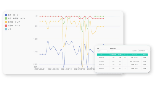 Google IPによる市区町村・任意の地点を選択し、登録キーワードの日付順位チャートから前日比較の変動までが確認できるため、随時キーワード順位を考慮した運用が可能になります。