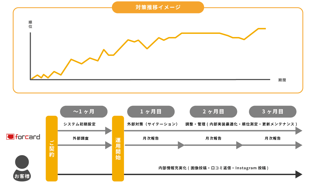 SEO対策やリスティング広告は約10万〜50万円/月かかるところ、forcardのMEO対策は数万円/月〜と、